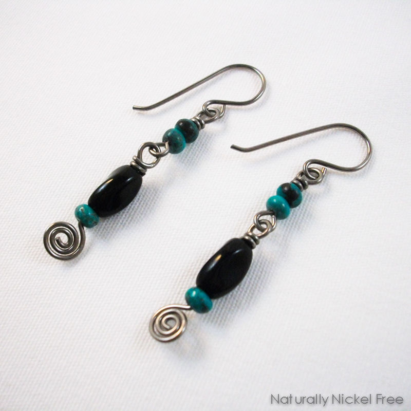 These colorful earrings are made with bright turquoise gemstone and black glass beads, completed with a small niobium wire spiral at the bottom, and classic French hook earwires. These lightweight earrings are 1 7/8 inch long (4.8 cm).